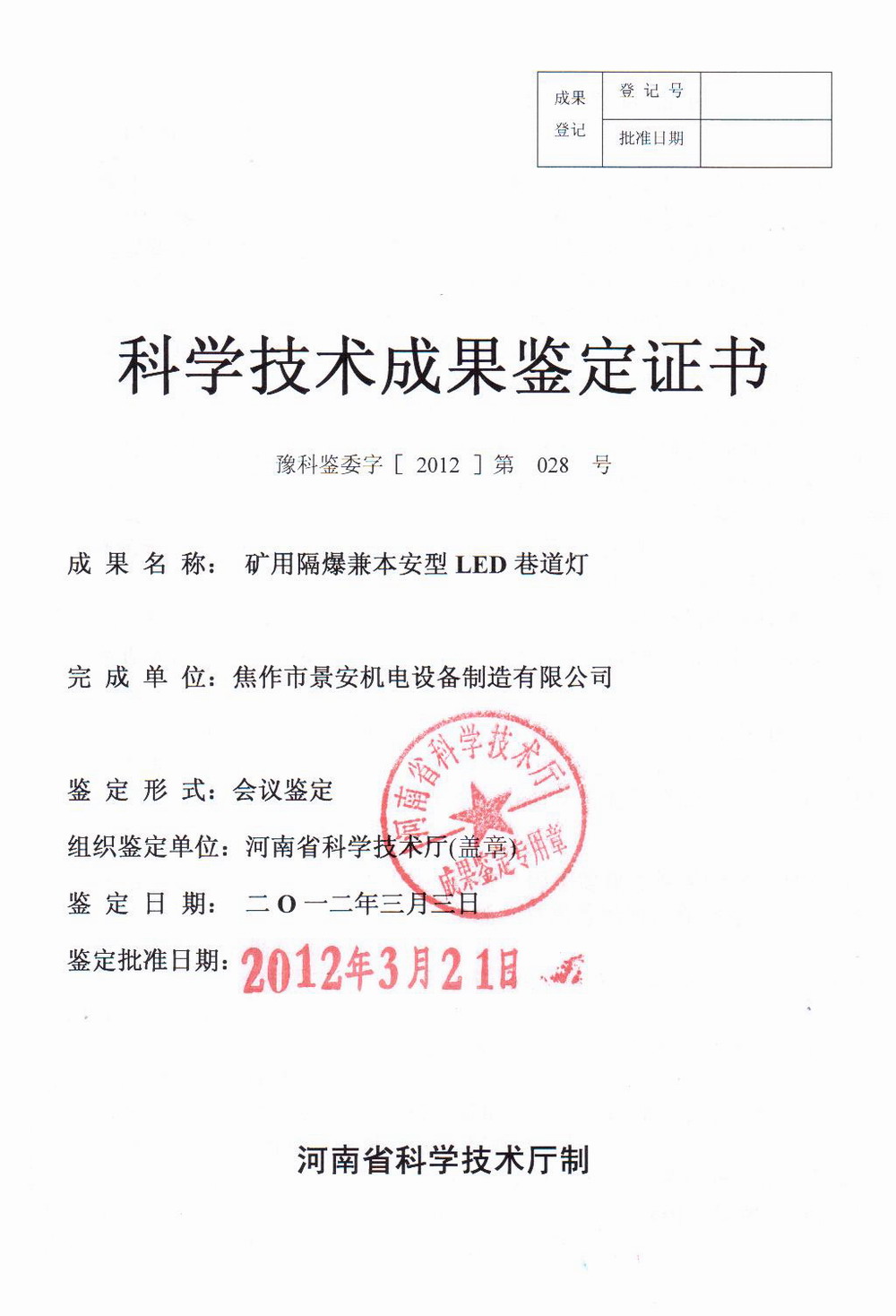 我公司開發(fā)的“礦用隔爆兼本安型LED巷道燈”項(xiàng)目通過省科技廳組織的科技成果鑒定