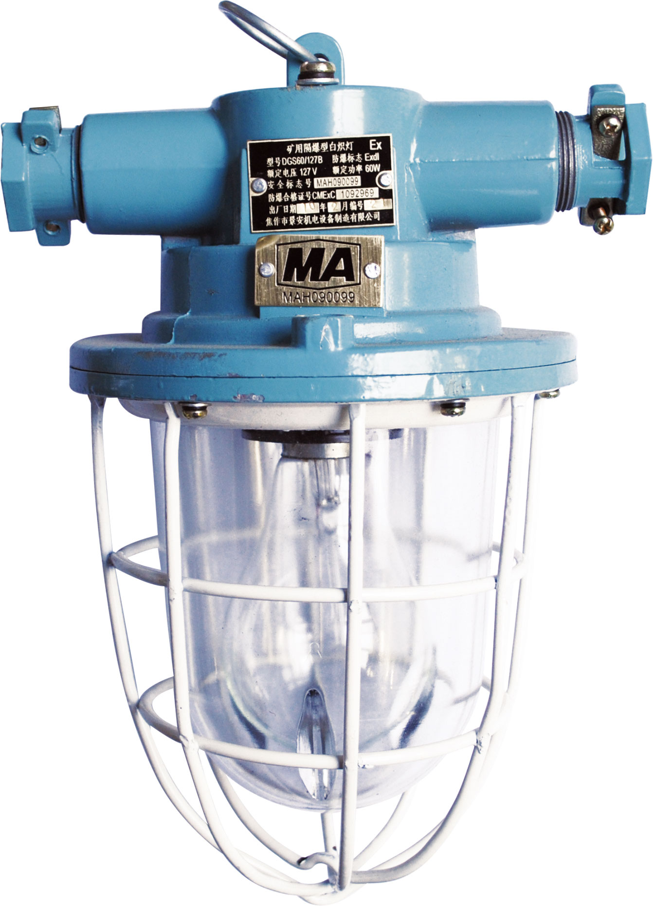 DGS60/127B礦用隔爆型白熾燈(以下簡(jiǎn)稱60W白熾燈)。適用于具有瓦斯及煤塵爆炸危險(xiǎn)的礦井中,可供車場(chǎng)及機(jī)電峒室、中心變電所、大巷運(yùn)輸、泵房等場(chǎng)所供照明之用。